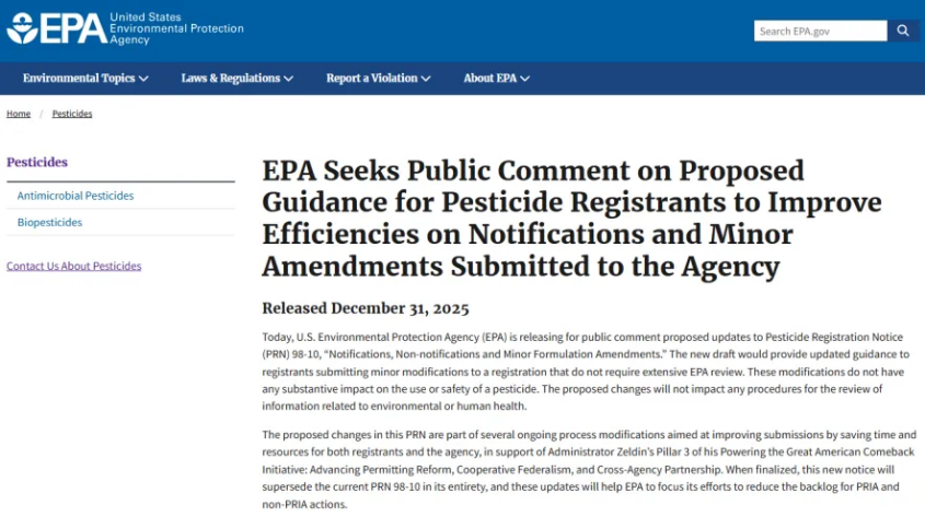 大农化网报道:近日,美国环保署(US EPA)发布公告,针对拟议更新的 PR Notice 98-10《通报、非通报及微小配方变更指南》公开征求行业意见。意见征集截止日期为2026年2月19日。 这是自1998年PRN 98-10发布以来,…